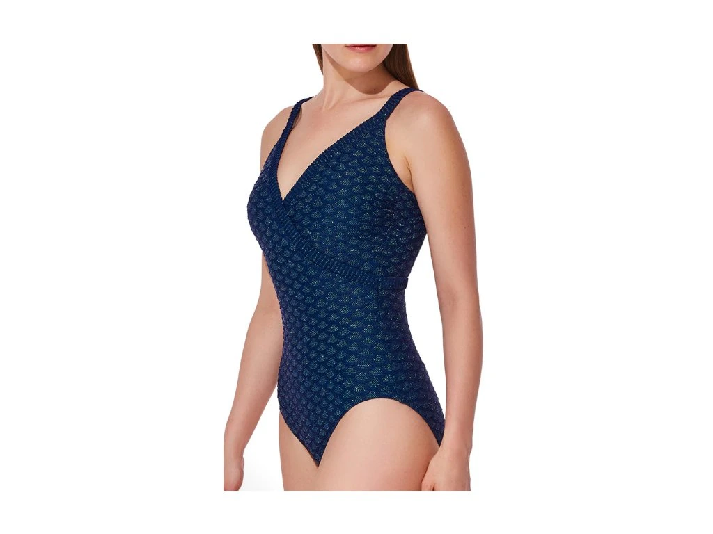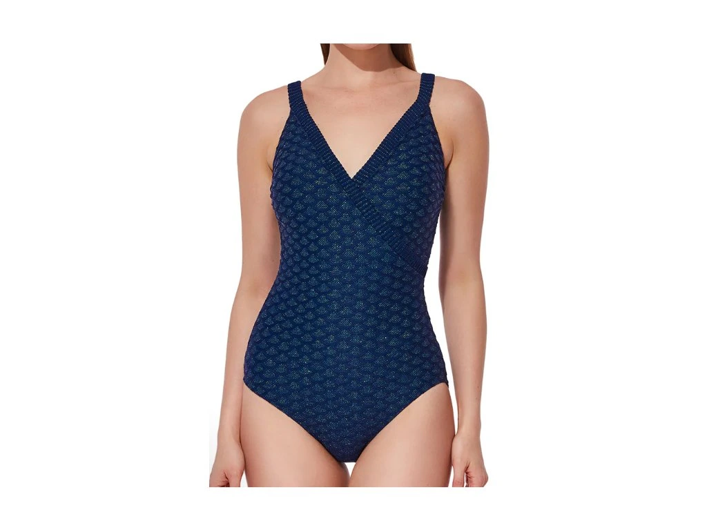 Plavky vyžarujú eleganciu a jemnú príťažlivosť. Vyrobené z trblietavej tkaniny s textúrou rybích šupín, má lichotivý výstrih, jemne vystužené mäkké košíky a spevnenú oblasť bruška pre hladký a sebavedomý strih.