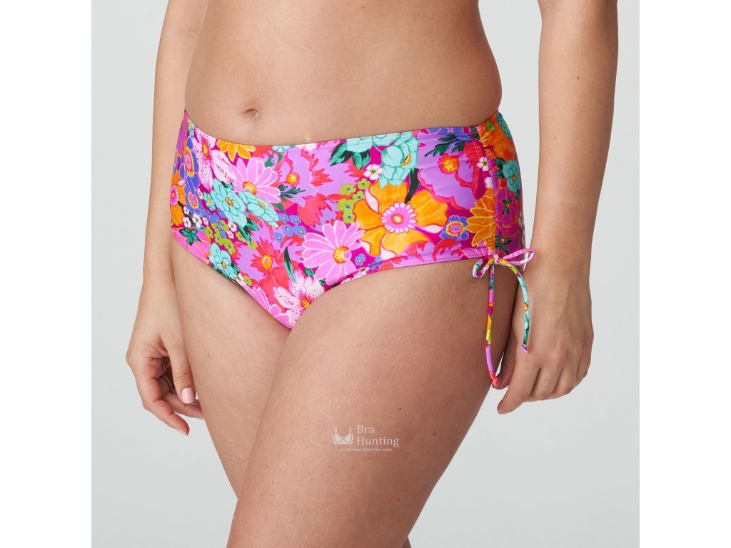 Plavkové nohavičky novej kolekcie NAJAC 2024 vo vysokom štýle s nastaviteľnými bokmi. Floral Explosion je kvetinová potlač prekypujúca farbami.